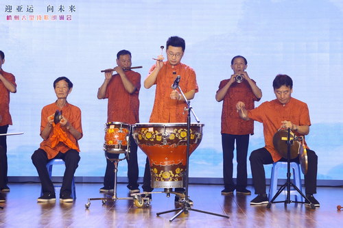 此外,杭州歌舞剧院首席男高音歌唱家、中国音乐金钟奖浙江赛区美声组金奖获得者张玉芳带来的歌曲《举杯吧,朋友》,也为朗诵会注入了澎湃的旋律,杭州市萧山区楼塔“细十番”协会带来的非遗项目《上马骄》更是将迎亚运的气氛渲染得淋漓尽致。