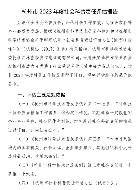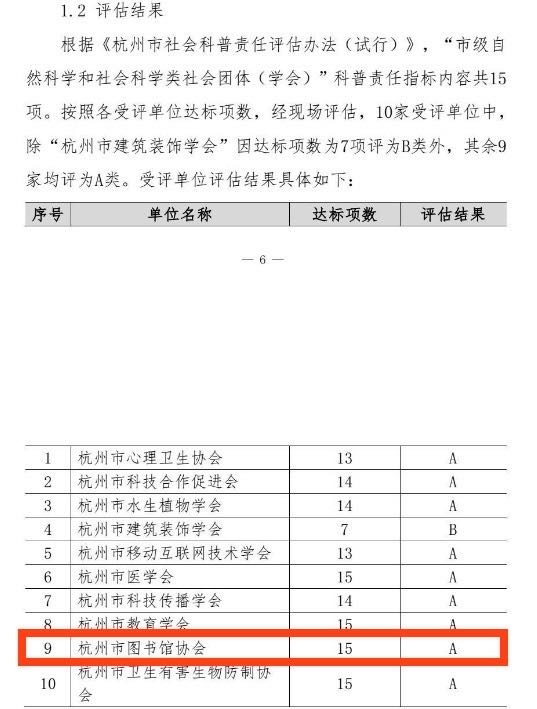 近日,市科学技术协会发布《杭州市2023年度社会科普责任评估报告》,对全市8类重点行业、重点单位和组织机构进行了科普工作评估,全面展现在“科技强市”建设上社会各界开展科普工作现状。杭州市图书馆协会作为市级自然科学和社会科学类社会团体的受评单位之一,在本次科普责任评估中荣获A类,充分体现了协会积极发挥平台阵地、专家队伍和基础资源等方面的优势,扎实履行社会科普责任,成效显著。